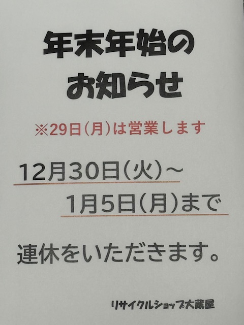 年末年始の営業日のお知らせ